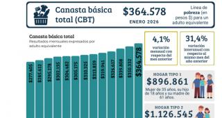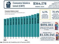 La Dirección de Estadística de Tucumán dio a conocer este jueves los valores de la canasta básica alimentaria (CBA) y de la canasta básica total (CBT) en enero de 2026. Durante el mes de enero, la variación mensual de la CBA con respecto a diciembre fue de 5,1%, y la de la CBT fue de 4,1%.